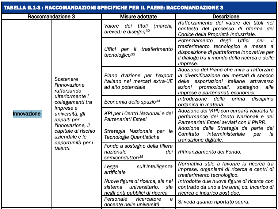 Nelle 30 pagine del testo, si parla di innovazione, ricerca e digitalizzazione, ma solo in chiave di rafforzamento del collegamento tra imprese e università (brevetti, centri di trasferimento tecnologico, intelligenza artificiale, semiconduttori).